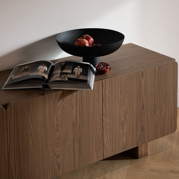 Dvě čelní strany poskytují praktický úložný prostor pro drobné doplňky, dokumenty a dekorativní předměty. Díky kompaktnímu tvaru a elegantnímu provedení se konzolový stolek Clea perfektně hodí i jako doplněk k větším kusům ze stejné řady.
