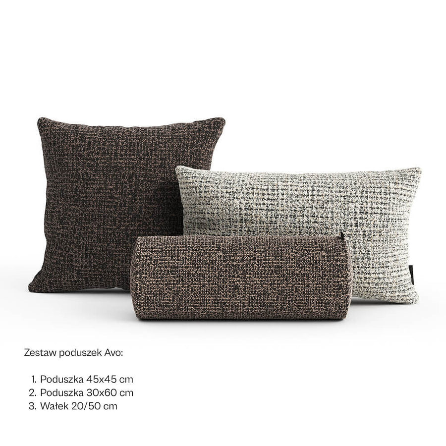 Sada dekorativních polštářů Avo je dokonalou kombinací elegance a pohodlí. Sada obsahuje tři polštáře v různých tvarech a velikostech: klasický čtvercový 45x45 cm, obdélníkový 30x60 cm a stylový podhlavník 20x50 cm. Každý polštář má melanžový vzor v odstínech tmavě a světle šedé, který dokonale doplní moderní i klasický interiér.