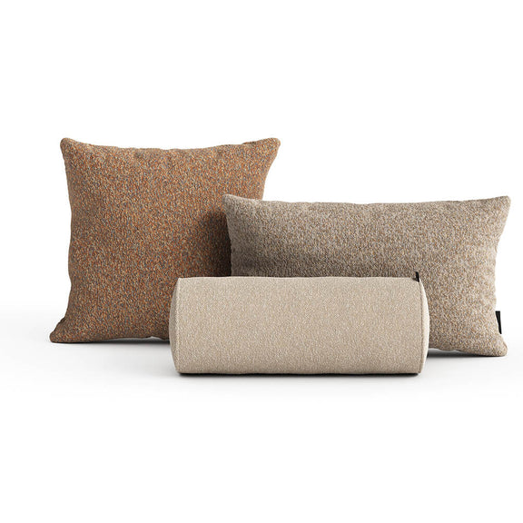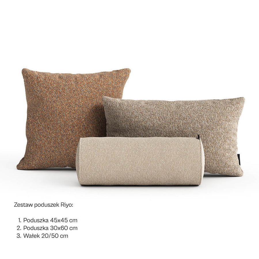 Sada dekorativních polštářů Riyo je jedinečnou kombinací pohodlí a decentní elegance. Sada obsahuje tři polštáře v různých tvarech a velikostech: klasický čtvercový 45x45 cm, obdélníkový 30x60 cm a praktický podhlavník 20x50 cm. Každý polštář má krásný melanžový vzor v odstínech teplé béžové a hnědé, díky čemuž je sada perfektním doplňkem moderního, skandinávského i klasického interiéru.